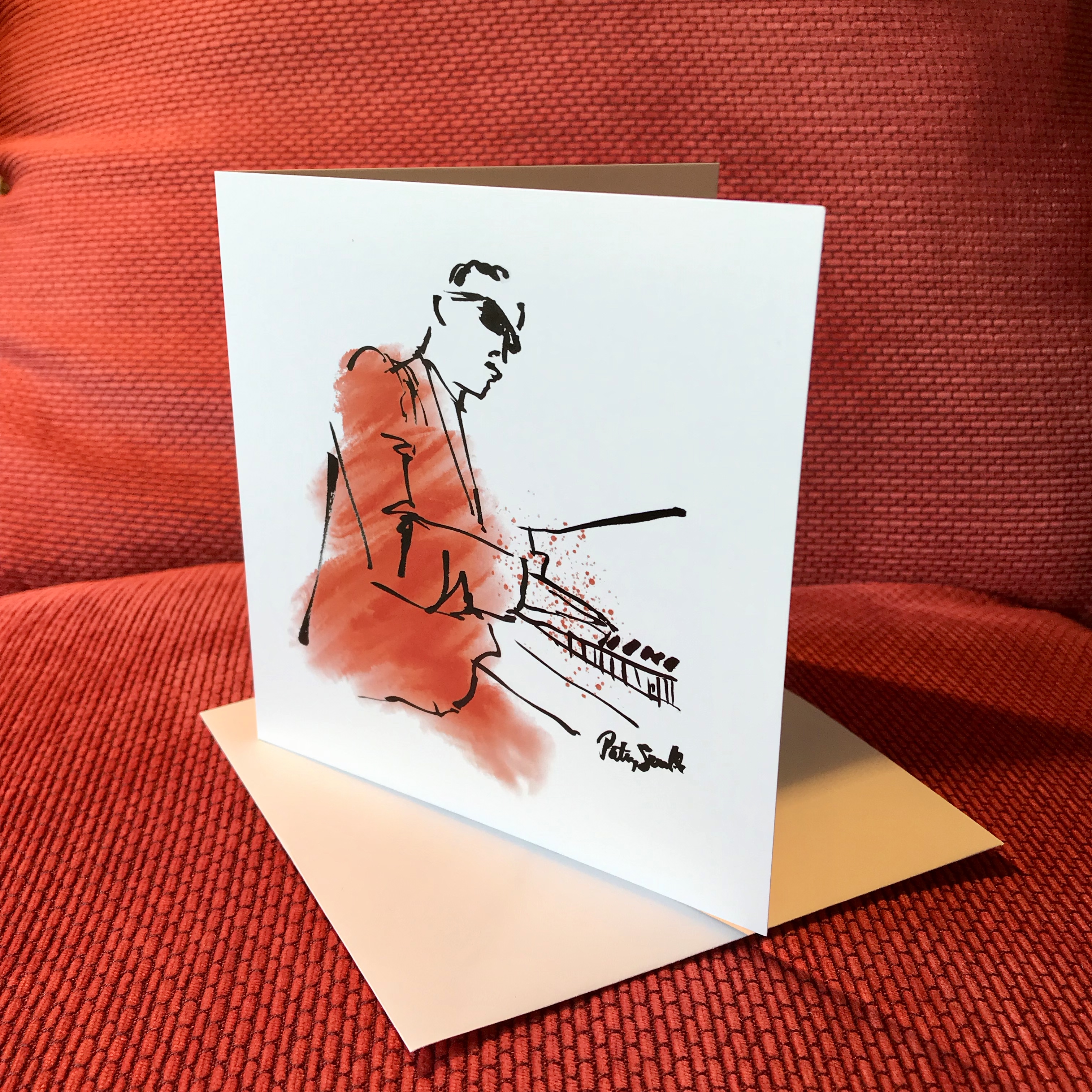 Pianist Greetings Card. This square card featuring my original pen and ink sketch of a pianist is blank inside for you to write your own message. It is professionally printed on white card, measures 145mm x 145mm and comes with a white envelope packaged in a recyclable clear plastic sleeve for protection. Price includes post and packing to UK & Europe. All cards are send in board backed envelopes to protect them.