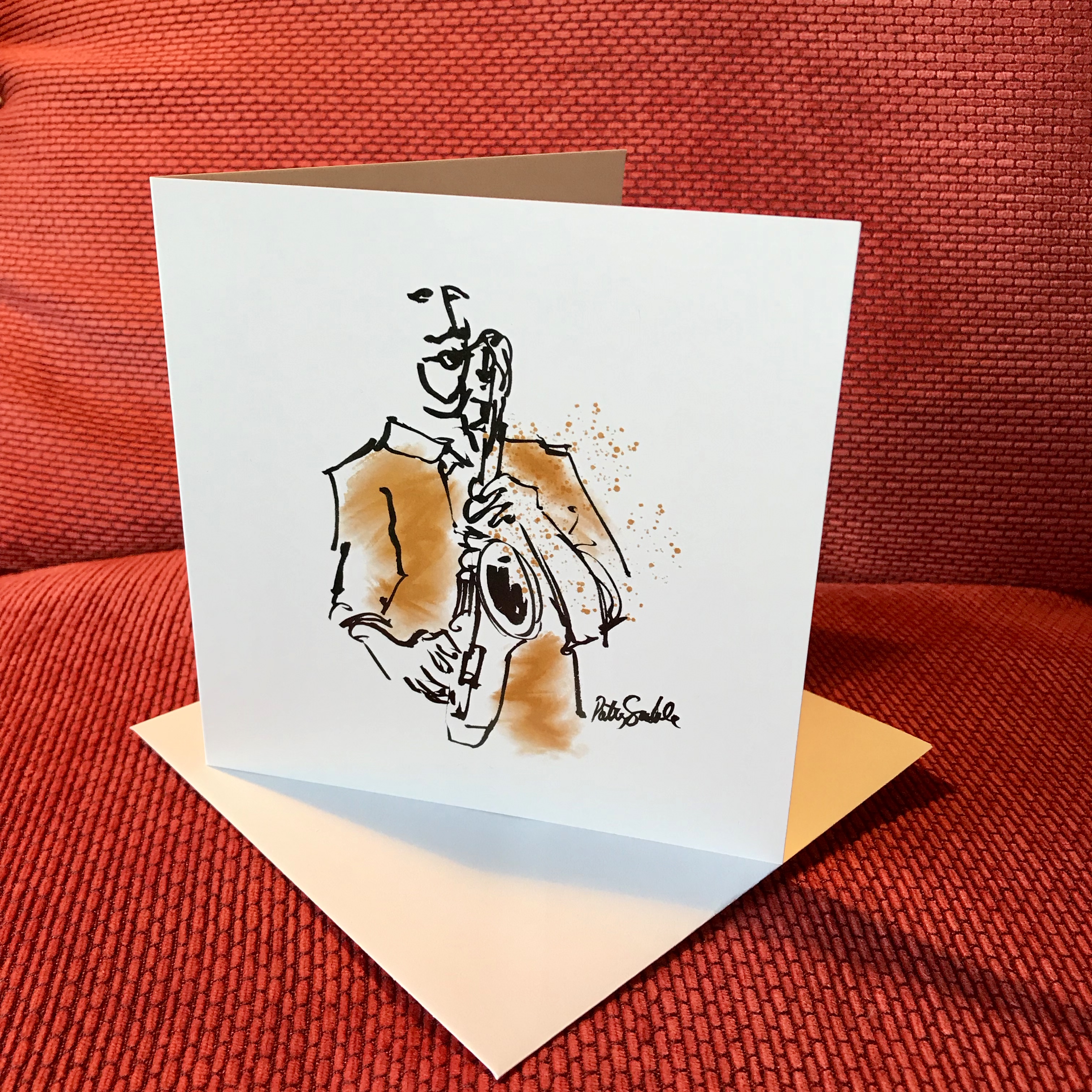 Saxophonist Greetings Card. This square card featuring my original pen and ink sketch of a saxophonist is blank inside for you to write your own message. It is professionally printed on white card, measures 145mm x 145mm and comes with a white envelope packaged in a recyclable clear plastic sleeve for protection. Price includes post and packing to UK & Europe. All cards are send in board backed envelopes to protect them.